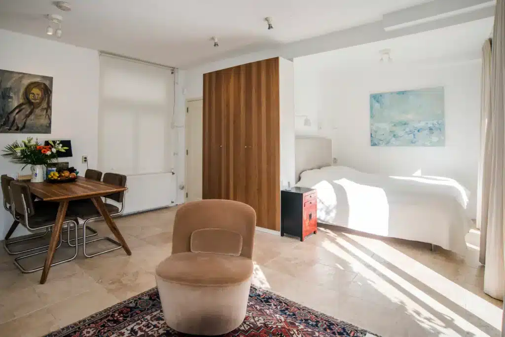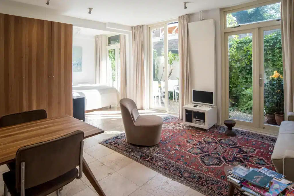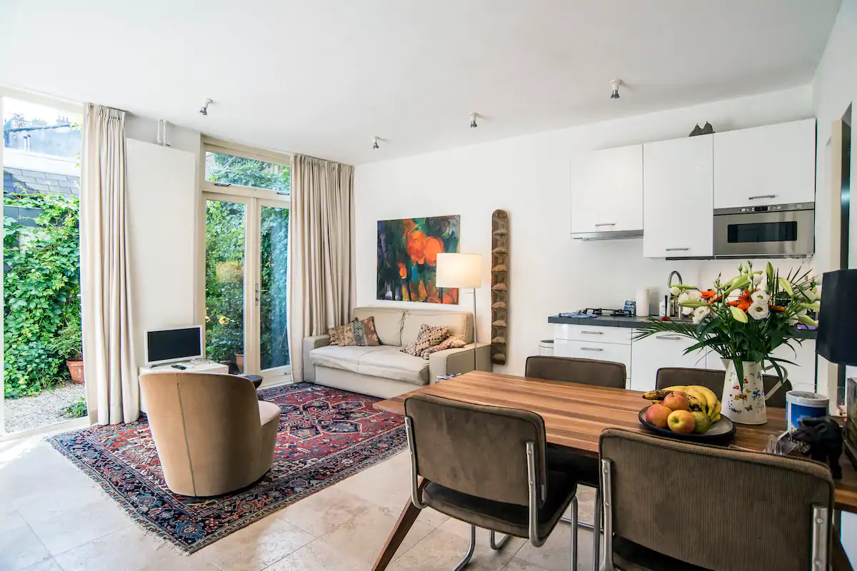 This is a very privat ground floor studioapartment( so no steep stairs) with your own privatgarden , in the peaceful so called backhouse of our canalhouse at the Amstel river. extremely central yet very quiet. A privat marble bathroom/ toillet, privat kitchen+ privat (Miele) washingmachine / dryer(etc.).2 minutes away from Central Station( subway), 9 minutes from World Trade center(subway). The subway entrance is 2 minutes